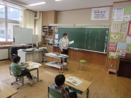 1年生の国語では、お勧めの本を友達に読んでもらえるようにする話を考えました。詳しくするにはどのような文を入れたらよいかについて話し合いました。