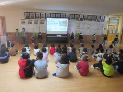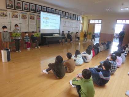 4年生の総合は「山田の自然を見つめよう」というテーマで学習を進めてきました。21日は、学習してきたことを全校の前で発表しました。山田川に生息する生き物やその生態について、クイズを交えながら分かりやすく伝えていました。発表を聞く子供たちもたくさん感想を話していました。