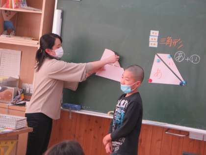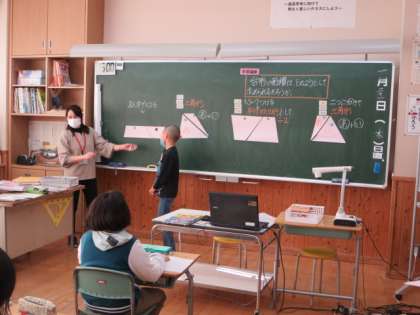 この日の5年生の算数の学習は、台形の面積に挑戦しました。子供たちは、意欲的に課題に取り組み、台形を平行四辺形や三角形に変形させて面積を求めました。次回は、台形の面積の公式を考えます。