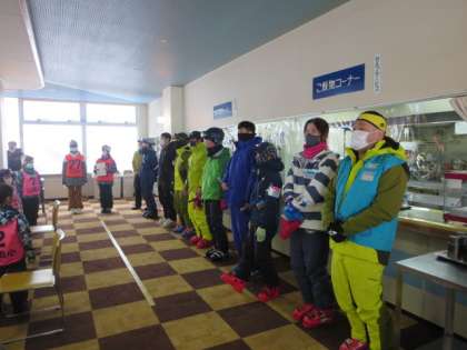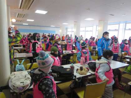 22日、全校スキー教室が実施されました。あいにくの雨模様のスタートとなり、開校式も施設内で行うことになりました。インストラクターの先生方の紹介があり、わくわくした子供たちの表情が見られました。
