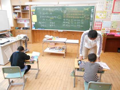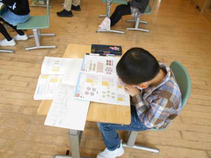 1年生は、算数の学習で「100までの数」を学習しています。10のまとまりのブロックがいくつ分で、ばらのブロックがいくつ分かを調べて、十の位や一の位の箱に数を書き入れました。
