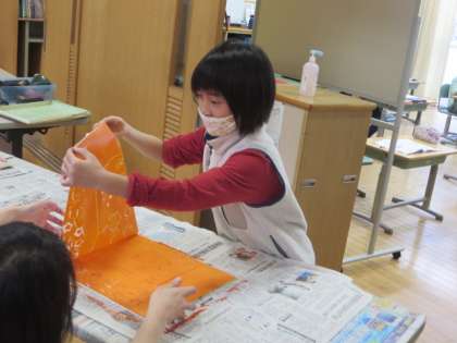 2年生はスチレン版画に挑戦しています。この日は、仕上がった版で版画を刷りました。思い思いのインクを付けたら、丁寧にばれんでこすります。紙を持ち上げると、みんな「わあ」と声を上げ、笑顔になっていました。