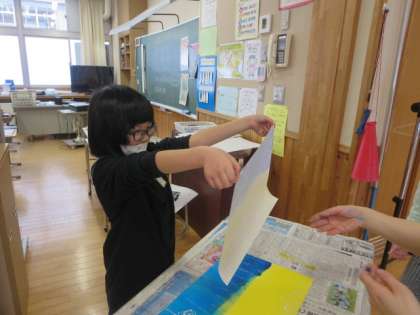 2年生はスチレン版画に挑戦しています。この日は、仕上がった版で版画を刷りました。思い思いのインクを付けたら、丁寧にばれんでこすります。紙を持ち上げると、みんな「わあ」と声を上げ、笑顔になっていました。