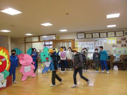 今朝のホールは、元気のよい挨拶が響きました。委員会の担当児童と山田小のキャラクターたちが、登校するみんなを笑顔で迎えました。気持ちのよい立春の朝となりました。