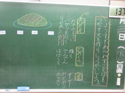 2年生の国語では、様子を表す言葉について知り、その言葉を使って、オムライスや猫などのことを詳しく文章に表しました。