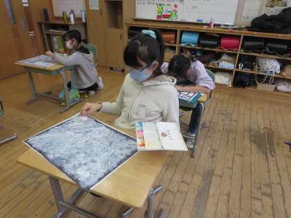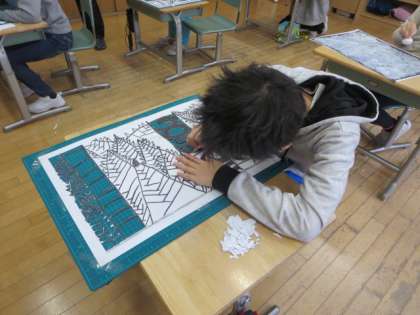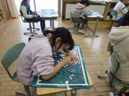 5年生はステンシル版画に取り組んでいます。下絵をカッターで切り抜く作業でしたが、どの子も集中して取り組んでいました。次は、その上に絵の具を置いていきます。どのような作品になるか楽しみです。