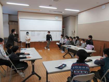 卒業を祝う会に向けて、1年生から5年生が集まり、代表委員会を開きました。お祝いの気持ちをどのようにして伝えたらよいか、学級で話し合ってきたことを伝え合いました。