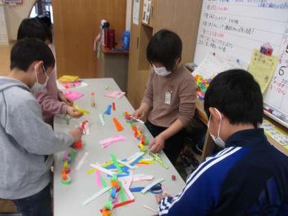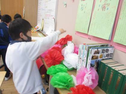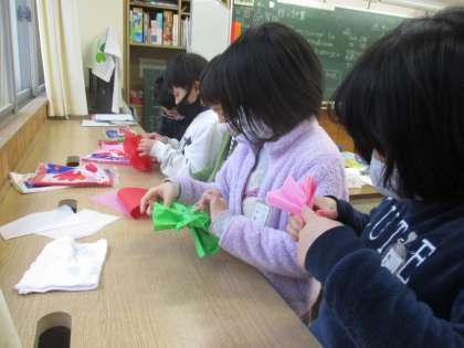 5年生の実行委員から3年生に依頼を受け、「卒業を祝う会」の会場を飾る「花」や折り紙チェーンの制作に取り組んでいます。6年生に喜んでもらいたいという願いをもって、意欲的に飾り作りに取り組みました。