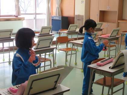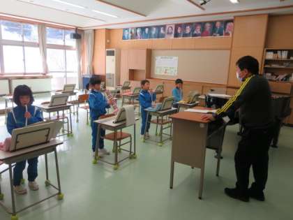 1年生の音楽では「子犬のマーチ」の合奏の練習に取り組んでいます。この日は、鍵盤ハーモニカや鈴、カスタネット、トライアングルを一人一人が持ち、リズムよく演奏していました。
