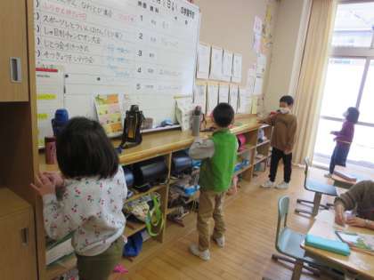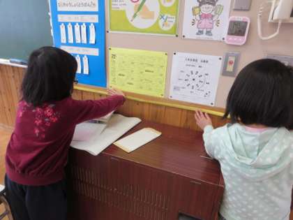 2年生の算数では、長いものの長さを学習しています。この日は、手作りの3メートル物差しで、校舎内の様々な物の測りました。