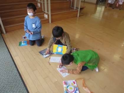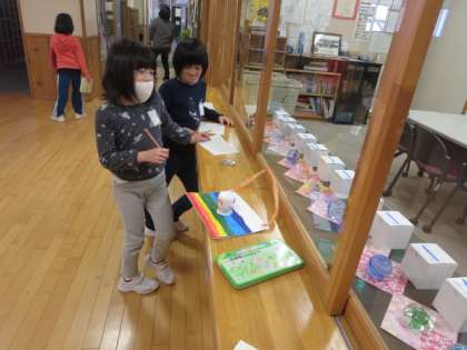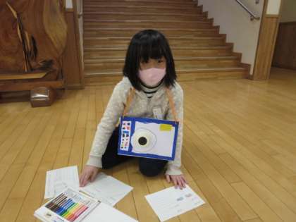 2年生の子供たちは、図工の時間に、プリンカップやリボン、画用紙で自分のカメラを作りました。その素敵なカメラを持って、顔に見える物を見つけようと校舎内を巡りました。どんな発見ができたでしょうか?
