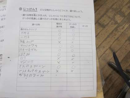 3年生の理科では、電気の次に磁石の学習が続きます。この日は、電気が通る物と磁石にくっつく物と関わりがあるのかを調べました。どのような関係が見つかったのでしょう。