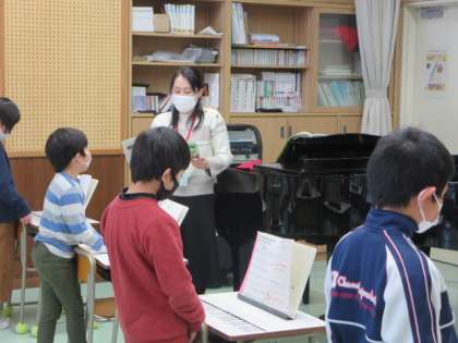音楽の時間は、「音の重なりを感じて合わせよう」という学習をしています。「エーデルワイス」をリコーダー演奏したり、「歌おう声高く」を歌ったりして、旋律の重なりを感じながら楽しんでいます。