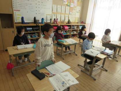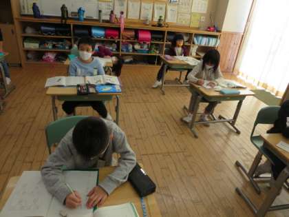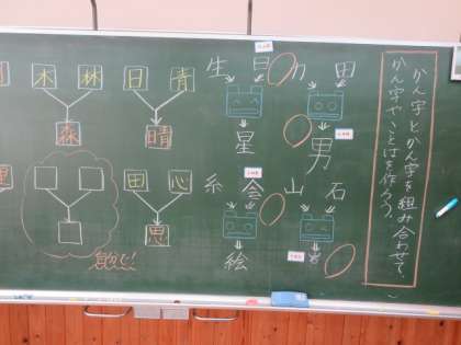 2年生の国語は、漢字と漢字を組み合わせる学習に取り組みました。子供たちは、これまで習った漢字を思い出して組み合わせ、いろんな漢字や言葉を発表していました。