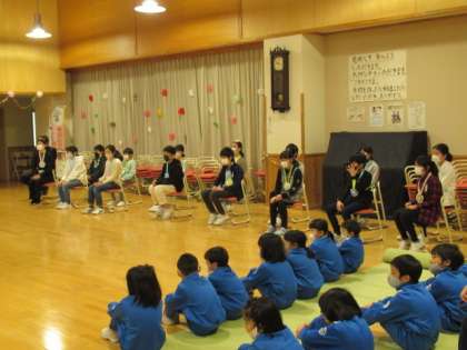 お祝いのトップバッターは、3年生でした。音楽で学習した曲のイントロクイズを出し、お祝いの替え歌で盛り上げました。その歌詞に、6年生はこれまでを思い返すかのように聴き入りました。