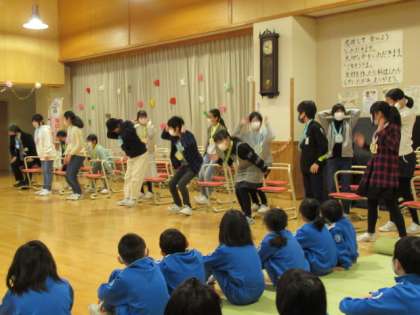 続いて4年生は、6年間の思い出クイズで盛り上げました。正解できないと、何とスクワットをしなくてはならないという試練が待っていました。途中に、小さな頃の写真も出てきました。今はすっかり、素敵なお兄さんとお姉さんです。