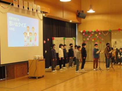 続いて4年生は、6年間の思い出クイズで盛り上げました。正解できないと、何とスクワットをしなくてはならないという試練が待っていました。途中に、小さな頃の写真も出てきました。今はすっかり、素敵なお兄さんとお姉さんです。