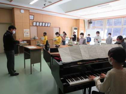 この日は、中学校の音楽の先生が6年生の卒業式の歌の指導を担当しました。的確なアドバイスで、子供たちの歌声はみるみる変わっていきました。