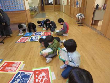 3年生は、版画の作品の鑑賞を行いました。友達の作品のよい所をたくさん見つけることができました。