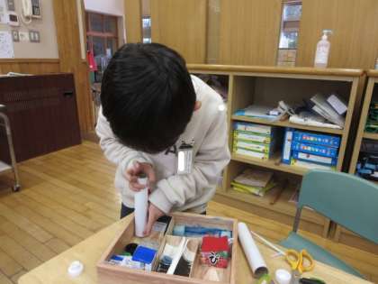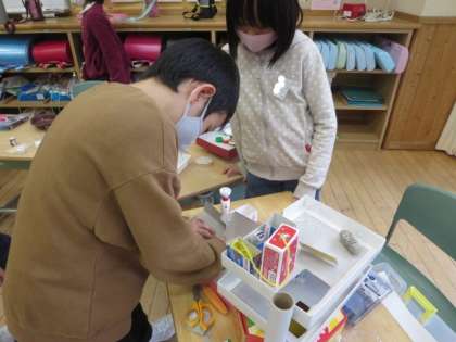 2年生が取り組んできた小さな友達の家作りも最終段階に入りました。最後にどんな工夫ができそうかを考え、集中して取り組んでいました。