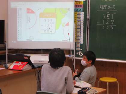 6年生の算数は総まとめの学習に取り組んでいます。この日は、世界の筆算を見て、どのように計算するのかを話し合いました。