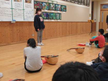 先週の練習から1週間が経ち、3年生もどんどんと上達しています。今日は、本番に合わせた繰り返しと、指揮を見ながら顔を上げて演奏する練習をしました。テンポが速くなる部分があるので、5年生の部長さんは「気を付けて練習しましょう」と、みんなに呼びかけました。