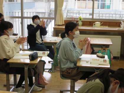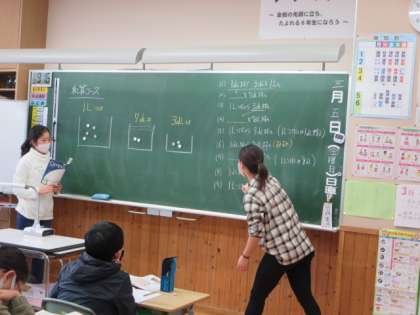 6年生の算数は、和算に挑戦しました。7デシリットルと3デシリットルの入れ物を使って、水を5デシリットルずつに分ける問題に取り組みました。問題を解くことのできた仲間にみんなから拍手が送られていました。