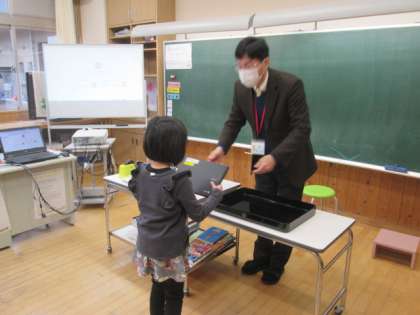 朝の集会で、教頭先生から、一人一端末を利用したこれからの学習について話を聞いた後、各教室で校長先生から、一人一人が端末を受け取りました。