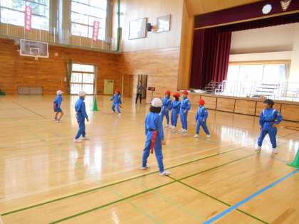 1,2年生は体育で、鬼ごっこ型の玉入れゲームの学習に取り組みました。子供たちは、安全地帯をうまく利用して攻撃をしたり、たすきのしっぽを取られないように素早く動いたりして熱心に活動しました。