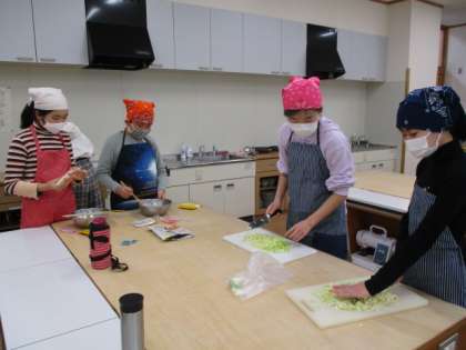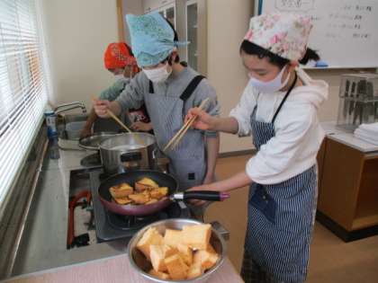 2年間の家庭科の学習で学んだことを生かして、調理実習に取り組みました。グループごとに話し合って決めた料理を、手際よく仲間と協力しながら作りました。おいしい料理にみんなが笑顔になりました。