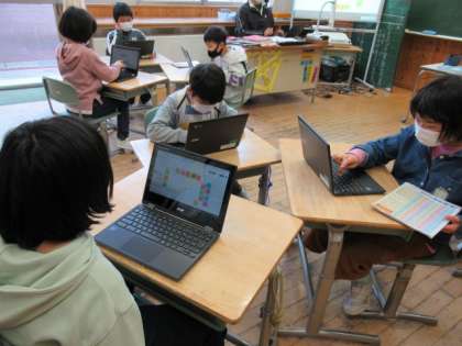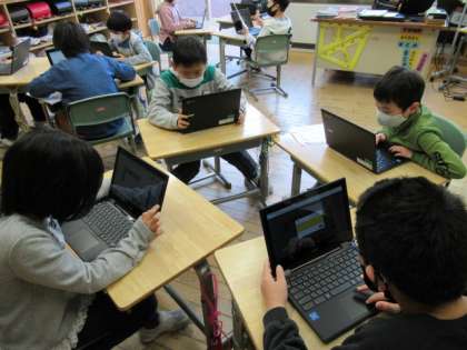 ジャムボードを使って、「春と言えば…」連想するもので、グループ学習をしました。「さくら」「卒業式」「入学式」等、思いついた言葉をカードに書き、ボード上に貼り付けると、グループで共有できます。「ああ、離任式もそうだね。」「桜は、植物だからこちらに移動させようよ。」とグループで話し合いながら、春のシートをつくりあげました。どんどん操作に慣れてきています。