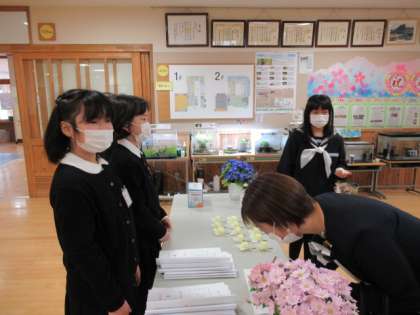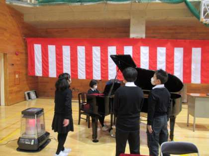 卒業式の朝、6年生を迎えるために、5年生はピアノ練習をしたり、その周りで歌を合わせたりして気持ちを高める様子が見られました。玄関では、保護者の皆様の受付をし、役割を果たしました。