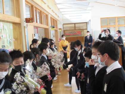式後、5年生から卒業生にお祝いとしていただいた啓翁桜と花束を渡し、お別れをしました。