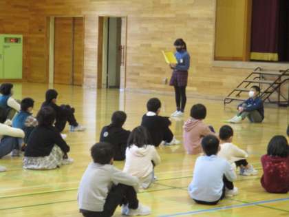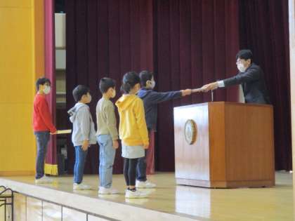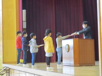今年度の修了式が行われました。各学年の代表児童が修了証を受け取り、3学期のがんばりを発表しました。