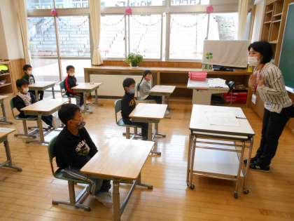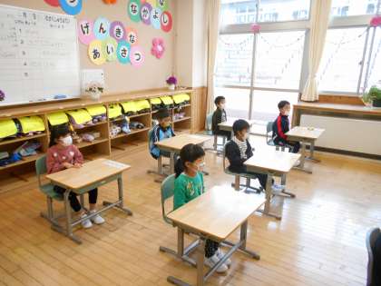 朝の会の様子です。1年生は、先生の話を落ち着いて聞いていました。4年生は、サイコロトークの話題で盛り上がっていました。