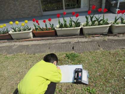 生活科で、校舎周辺で春探しをしました。「このチューリップ変わった色だね。」「パンジーがおじさんの顔みたいだよ。」と、発見したことをカードに書きました。