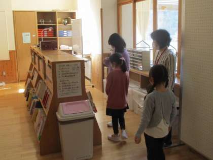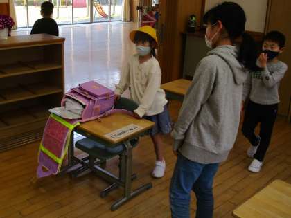1年教室では、登校後の1年生さんを優しくサポートする6年生の姿がみられました。持ち物の片付け方を教えてあげたり、読みたい本を一緒に選んであげたりしていました。