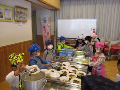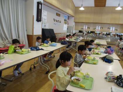 自分たちで支度をし、小学校初めての給食をおいしく食べました。