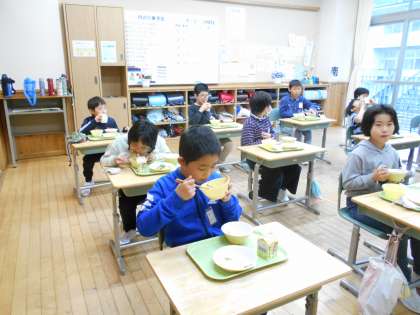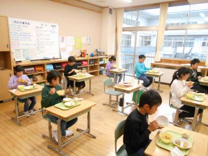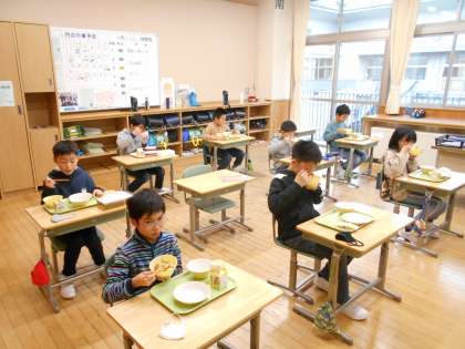 4〜6年生は、教室で給食を食べます。もりもり食べて栄養をつけましょう。