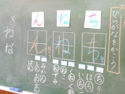 1年生は「ち、ね、ん」のつく言葉をみんなで考えました。その後、形に気を付けて、ひらがなを練習帳に書き込みました。