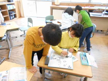 3年生は社会科で、学校のまわりの様子を地図に表す学習に取り組みます。地図には何をかきこむとよいか考えました。