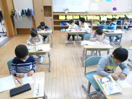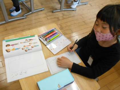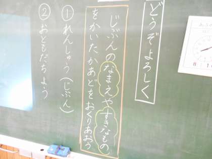 1年生は、名前やすきなものをカードに書きました。友達と見せ合って自己紹介をします。