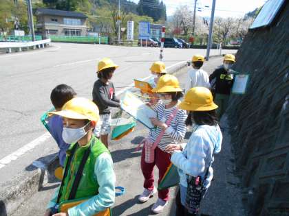 3年生は、学校の北の方面に出かけて、中村や小島の町内にある「みんなが使う場所や生活に関係のある場所」を見付け、手持ちの地図に書き込みました。