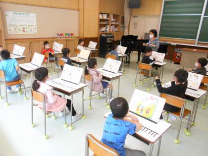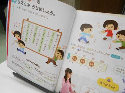1年生は音楽科で、曲に合わせてリズム打ちを楽しみました。ペアをつくって、調子を合わせて取り組みました。