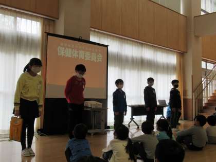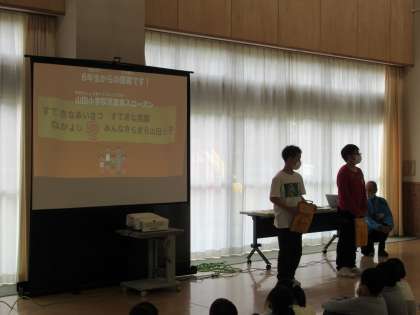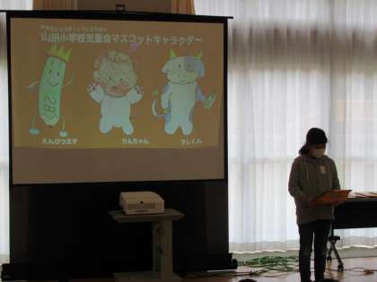 児童会のスローガンと今年度のキャラクターを伝え、これからどんな山田小学校をめざしていくか、そのためにどのような委員会活動を行っていくか全校のみんなに伝える会を行いました。5,6年生の活躍を期待しています。