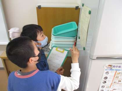 家庭科室にある用具の種類や場所等を確認しました。「ここに計量カップがある」、「包丁は危ないからしまってあるのだね」など、子供たちは次々と用具を見つけ、家庭科室に詳しくなりました。