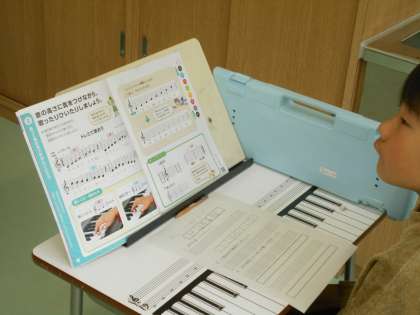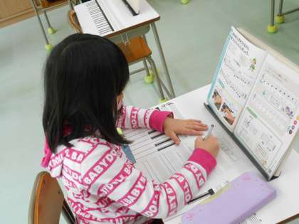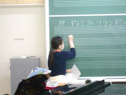 3年生は、ドレミファソラシドの階名を、音符に書き表すことを学習しました。五線譜の中に書き込みながら、音の高低を感じていました。