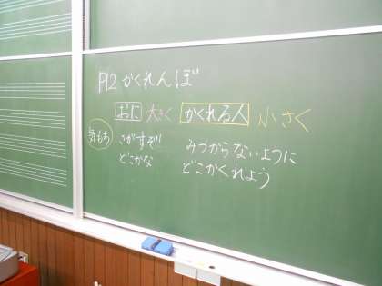 2年生は音楽科で、かくれんぼの遊び歌を、声の強弱を考えて歌っていました。子供たちは元気に歌うところと、そおっと歌うところを考えて表現しました。