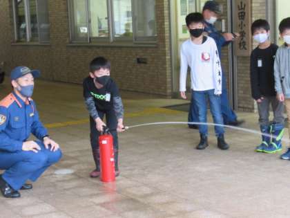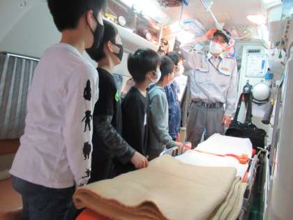 バッジ授与式の後、水消火器を使った放水体験や救急車両の見学をさせていただきました。「落ち着いて行動することの大切さを学んだ」、「消火器の正しい使い方を知ることができた」など、防火の意識が高まりました。