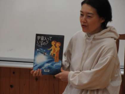 今日の本は「宇宙人っているの?」というお話でした。熱い海の星、氷に覆われた星、いろいろな環境の中でどんな生物がいるのか想像しながら、お話を楽しみました。